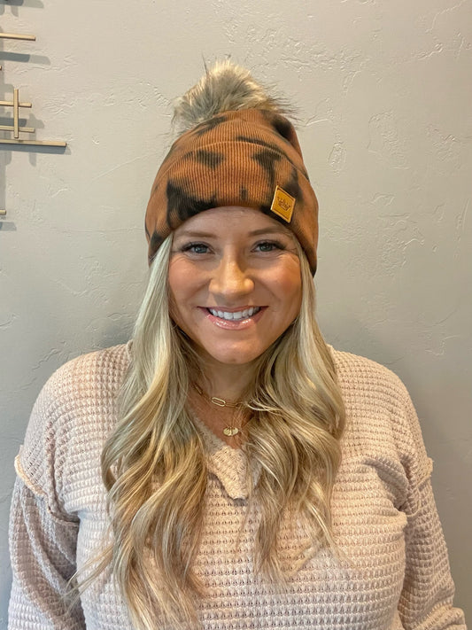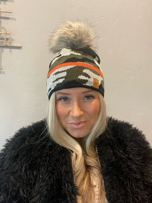 Adorable fleece lined green camouflage knit pom beanie with orange stripe