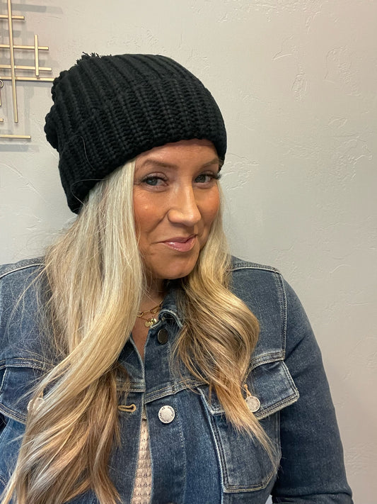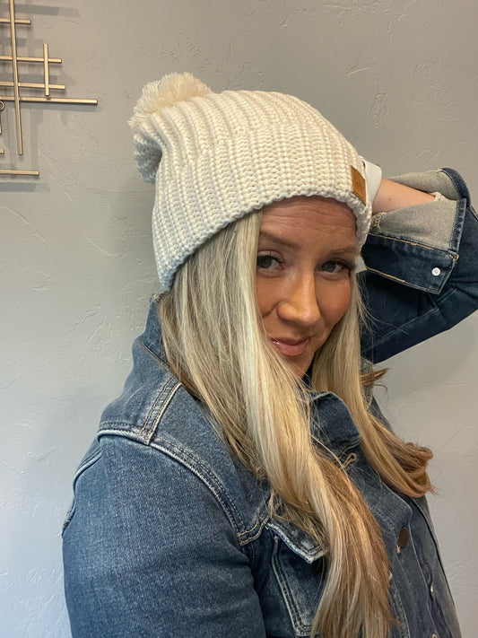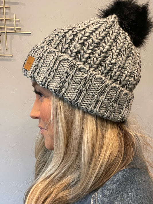 Adorable fleece lined grey & black cable knit beanie with pom accent
