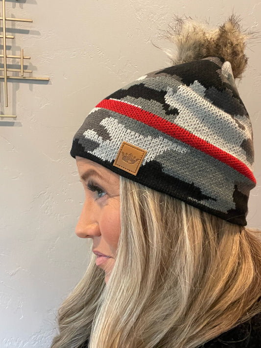 Adorable fleece lined gray camouflage knit pom beanie with red stripe