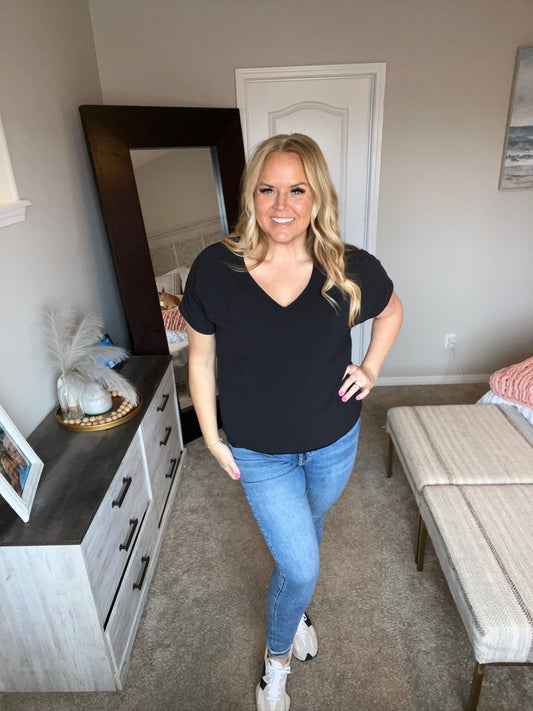 Frequently Asked Questions V-Neck Top in BlackRegular price $26.00 USDRegular priceUnit price per-