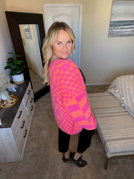 Noticed in Neon Checkered Cardigan in Pink and Orange by RM