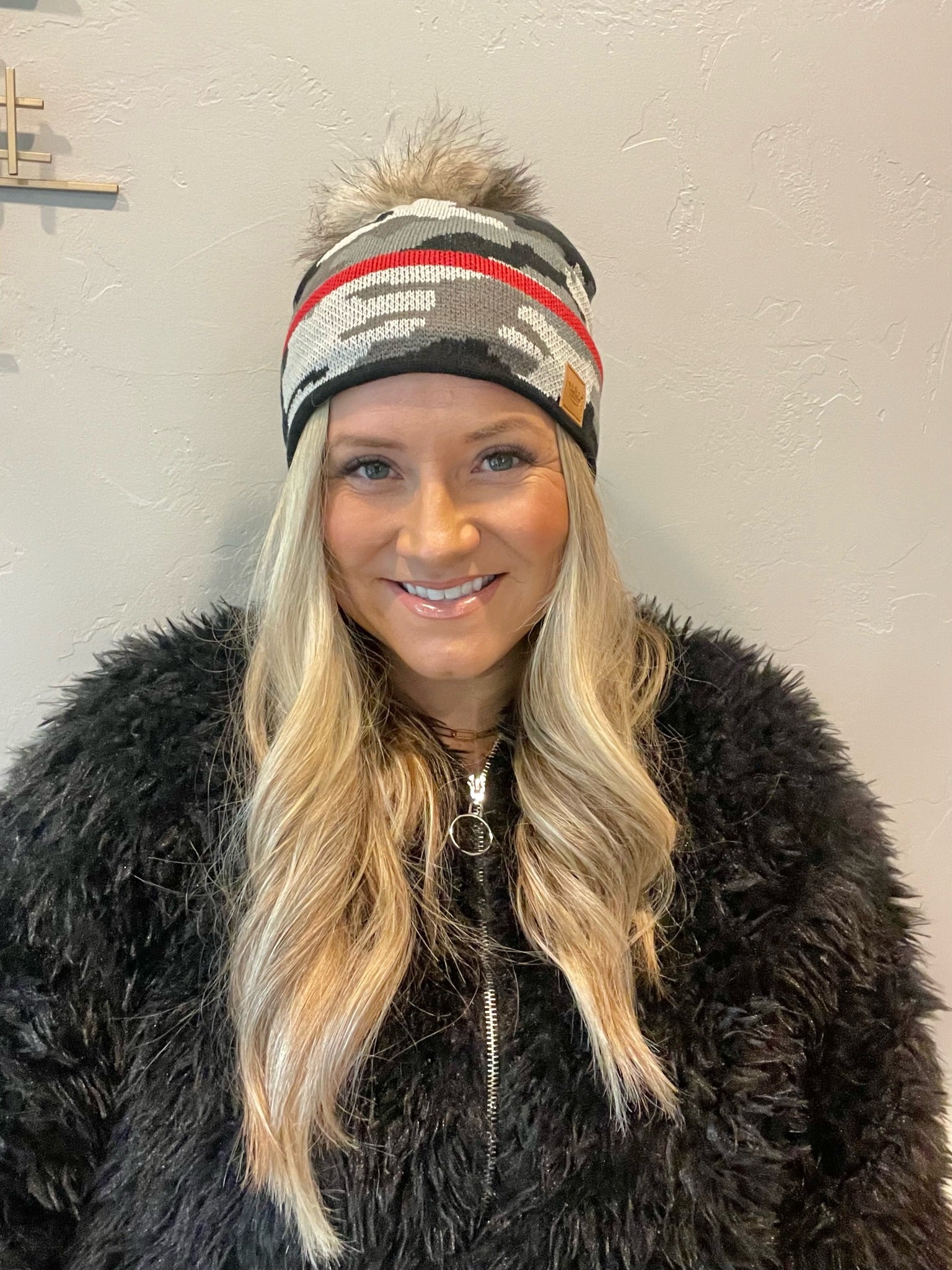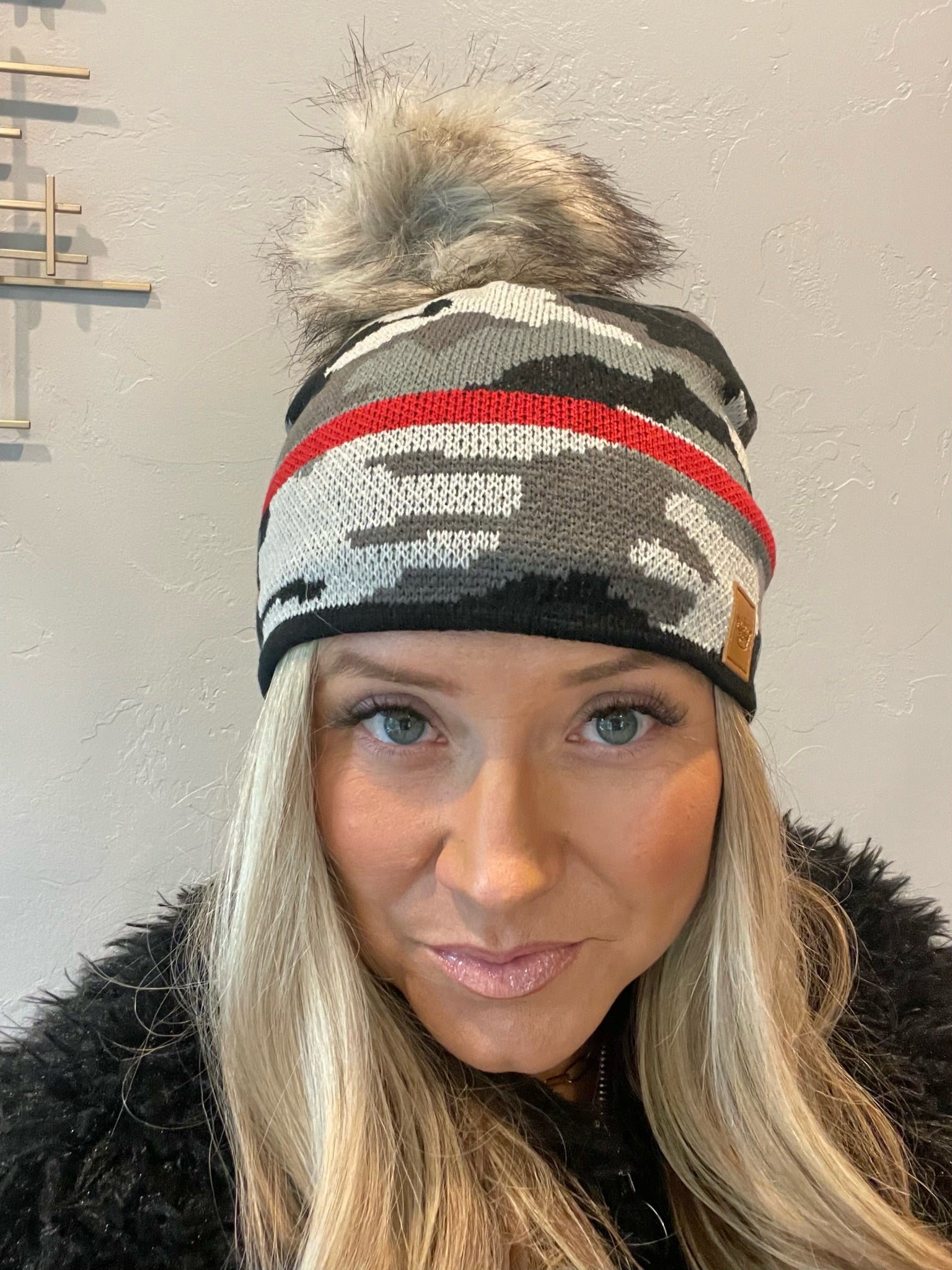 Adorable fleece lined gray camouflage knit pom beanie with red stripe