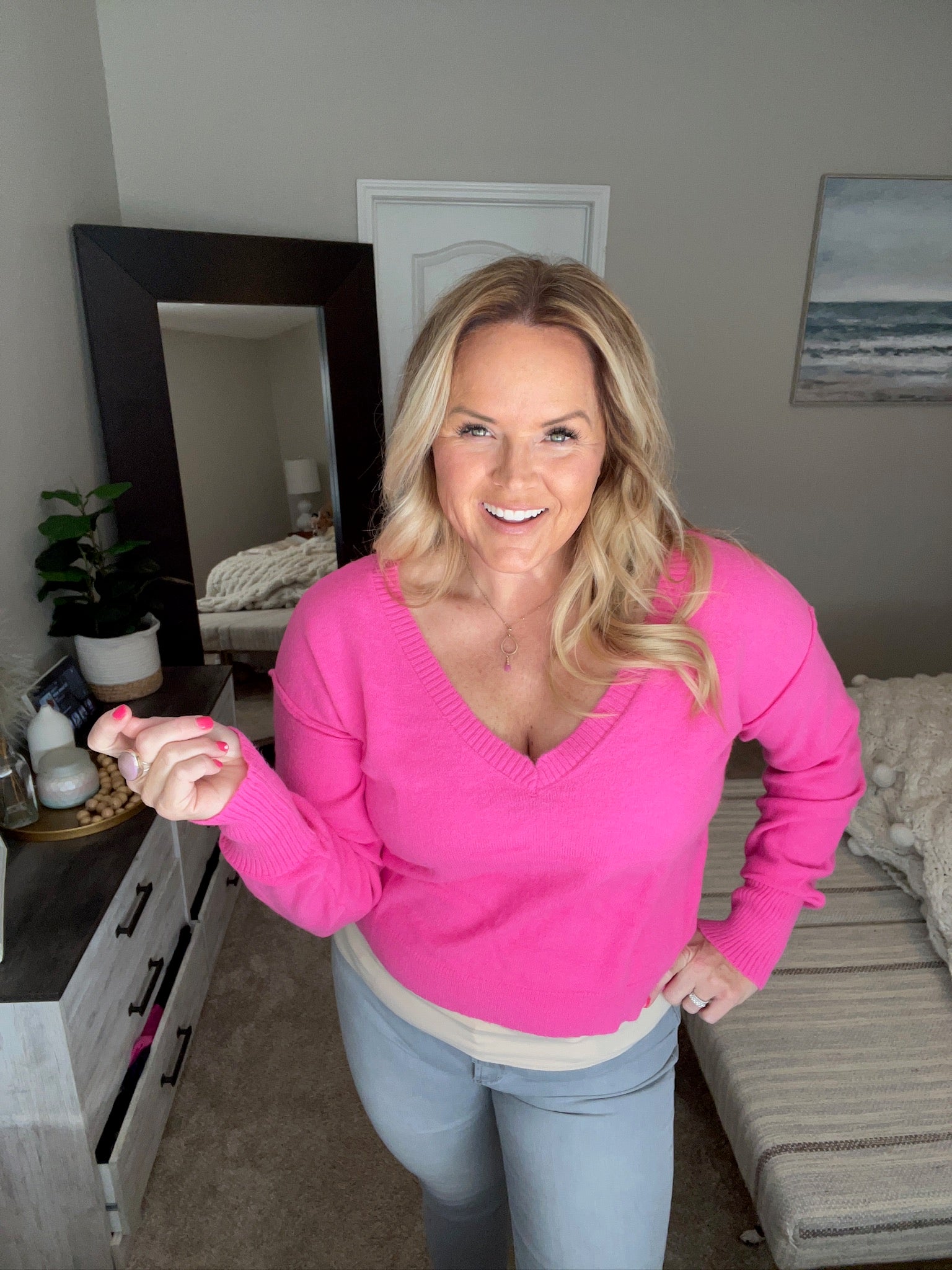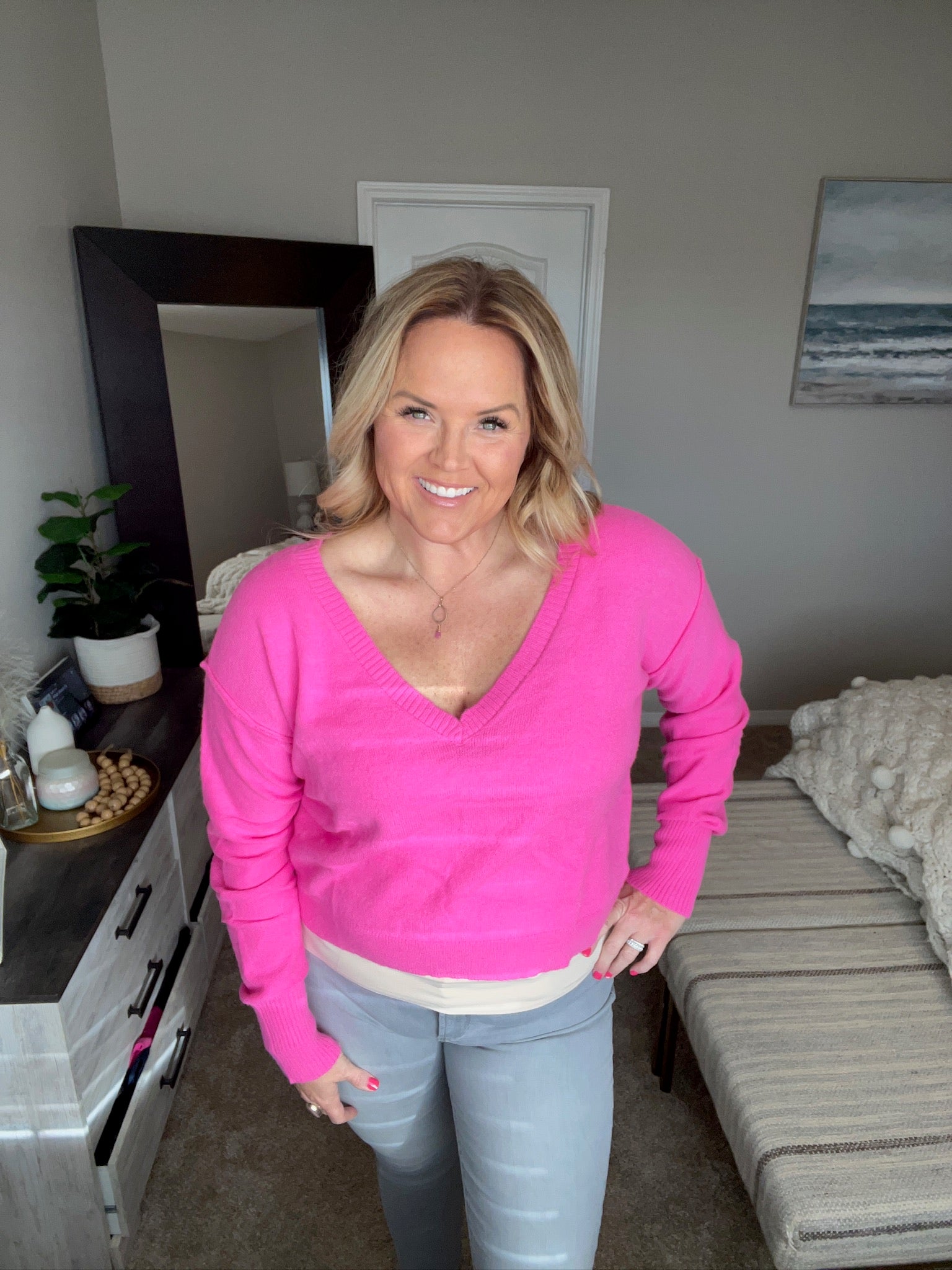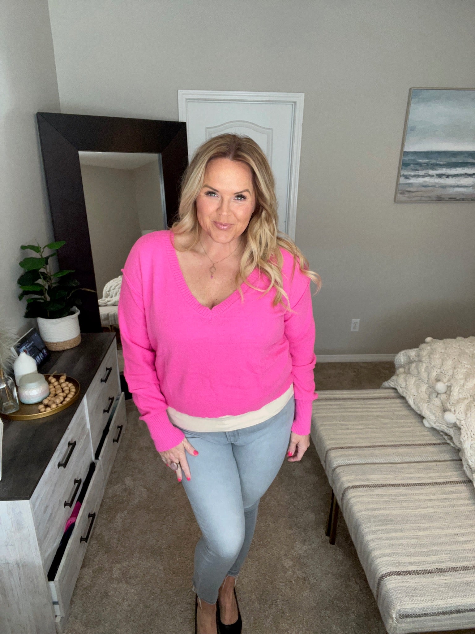 Stay stylish and cozy in our Back to Life V-Neck Sweater! Made with lightweight sweater knit and featuring a ribbed V-neckline, drop shoulder, and exaggerated ribbed sleeve cuff for a chic touch. Exposed seams add a unique detail. Perfect for the "pink girlies" who want to slay in comfort or style.