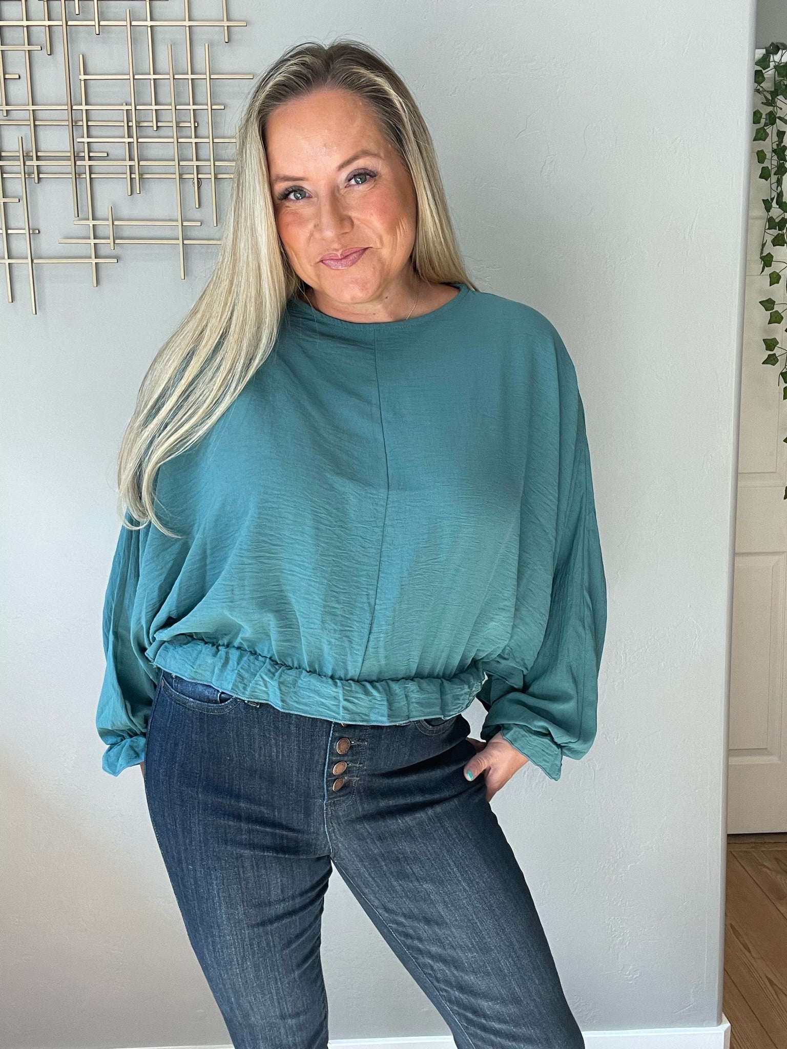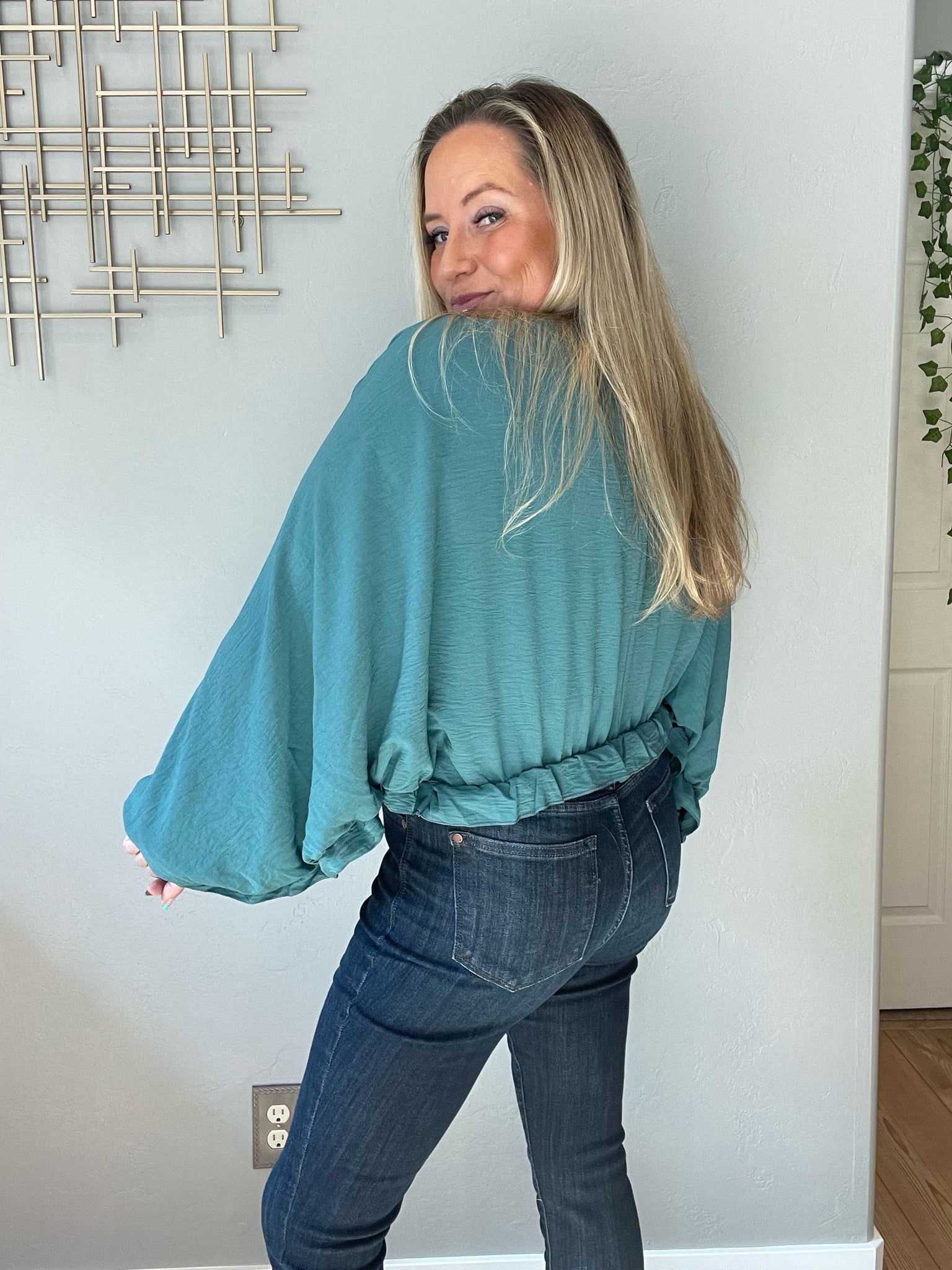 This Winging It Ruffle Detail Top in Teal is an easy way to add some texture and movement to any outfit. It features a comfortable, textured woven fabric with classic batwing dolman sleeves and soft ruffle trim details along the sleeve and hem. A cropped length and ruffled hemline completes the look for a perfect fit.