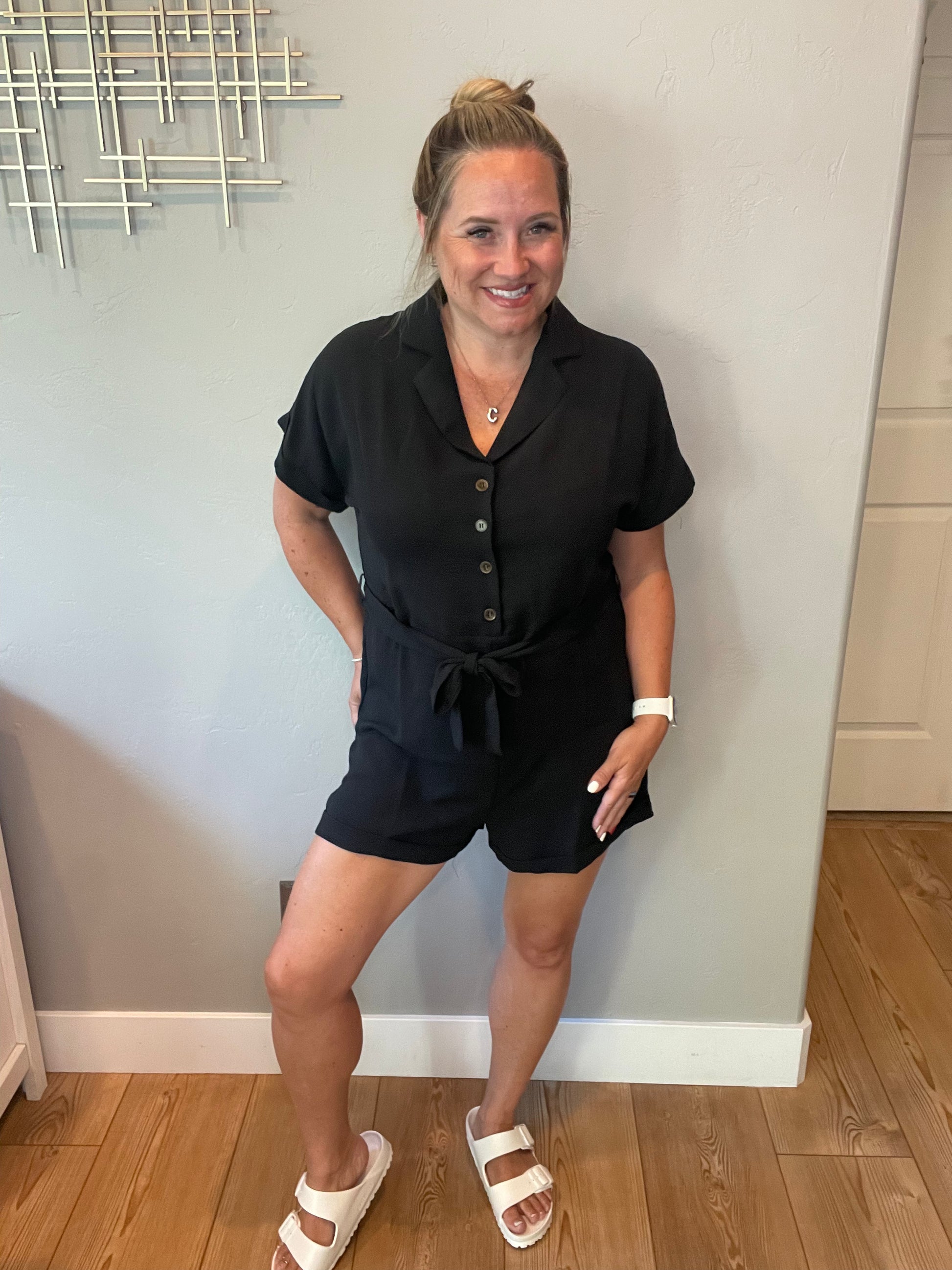 Stay cool and carefree in our Don't Worry 'Bout a Thing V-Neck Romper. Made with crinkle woven fabric, this romper features a collared neckline, dolman sleeves, and tacked cuffs. The front button closure and functional tie at the waist add a touch of functionality to this stylish piece. Perfect for any summer day!