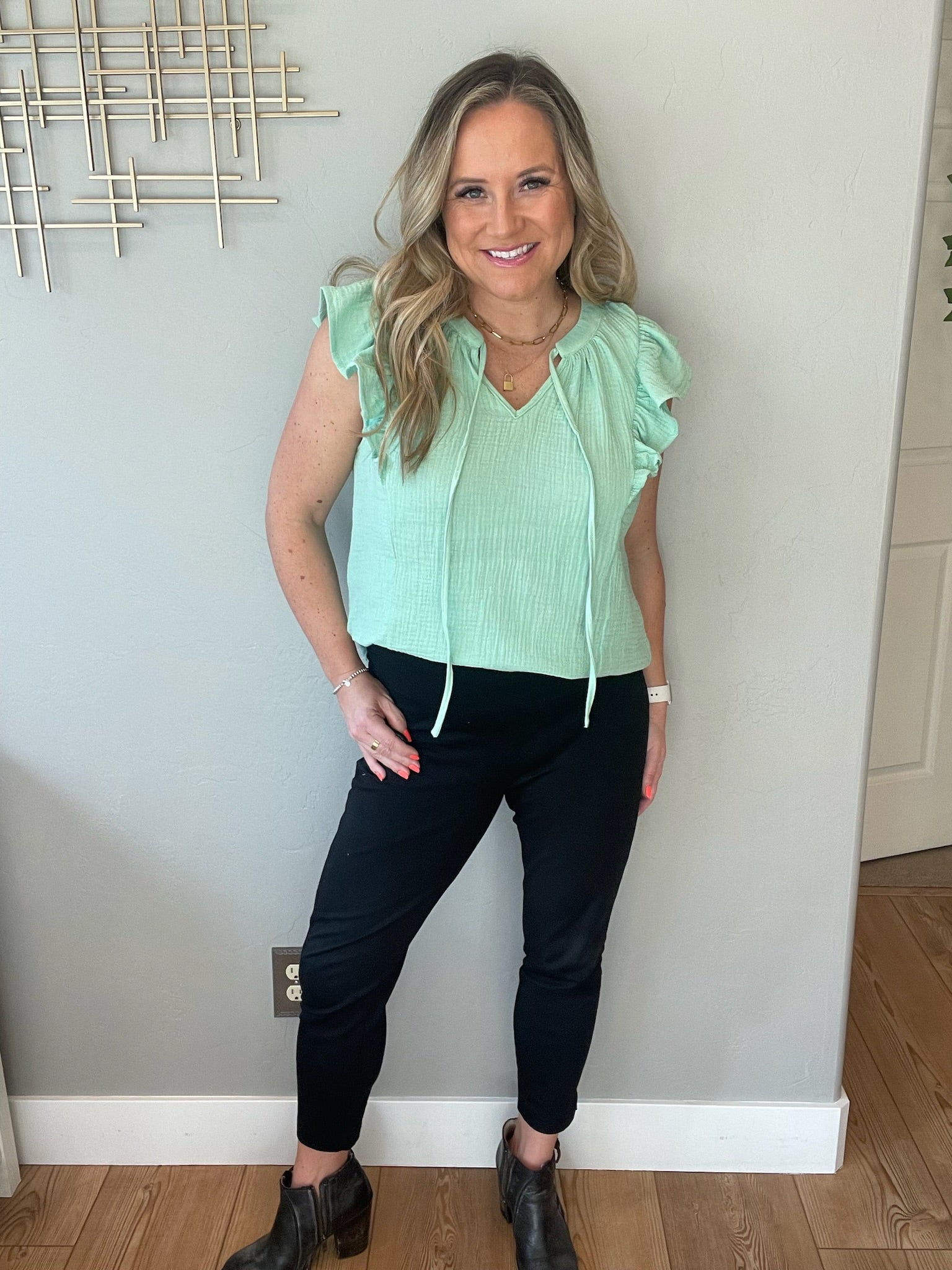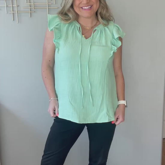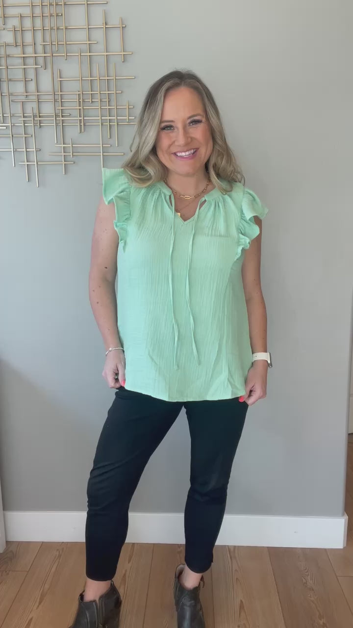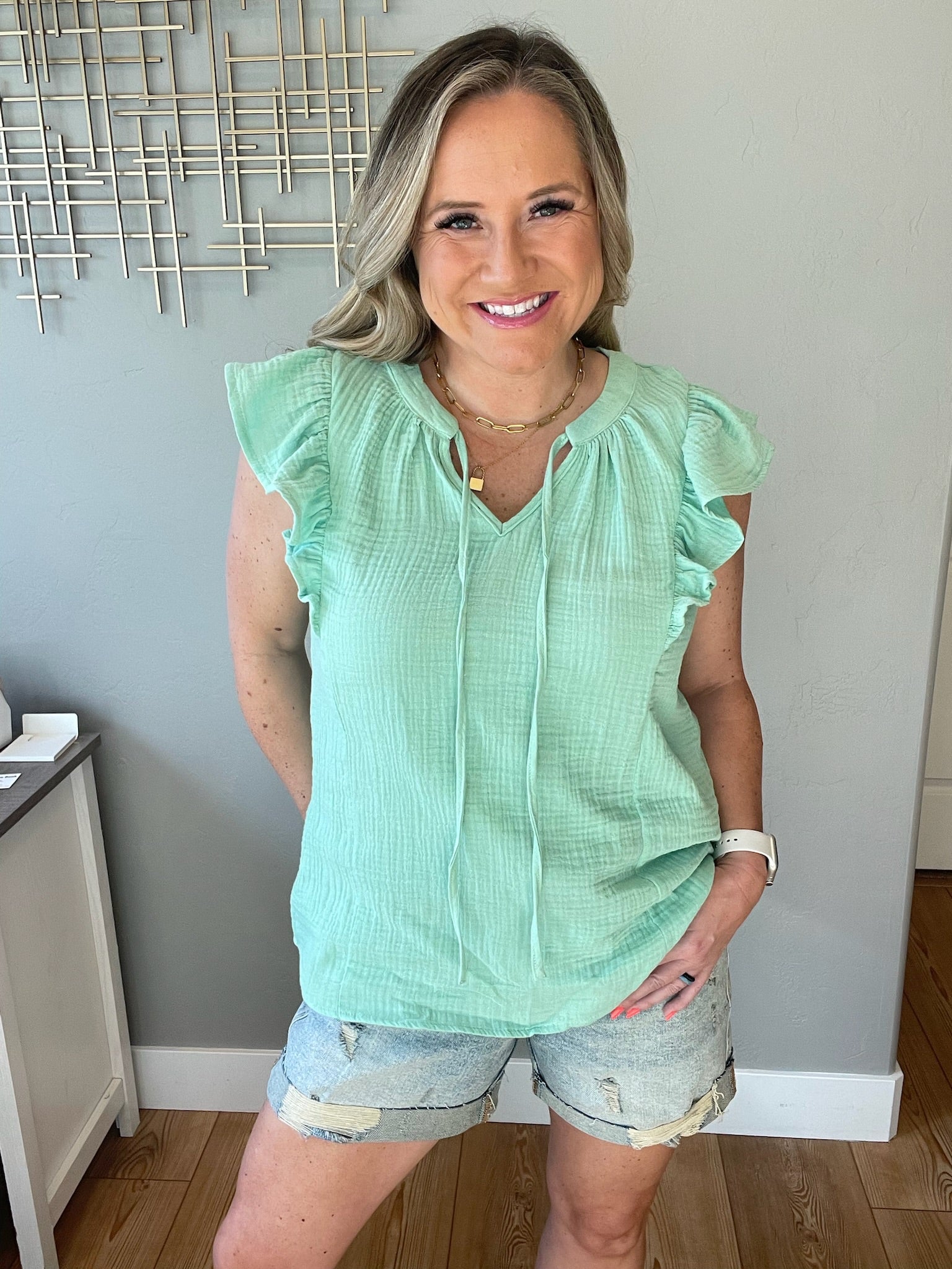 Gauze Keyhole Neckline Flutter Sleeve Blouse in Sage