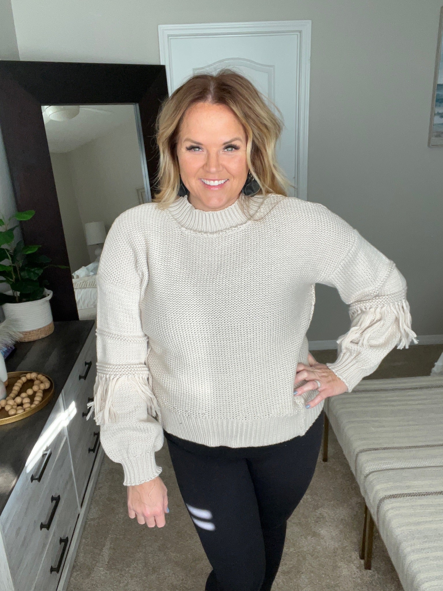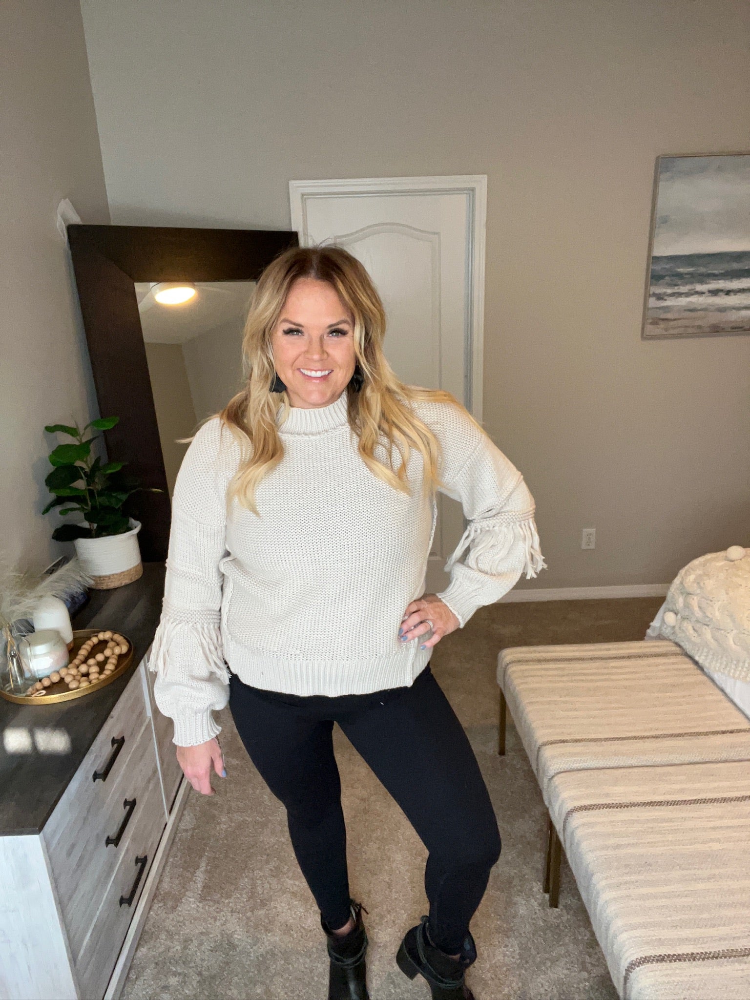 Embrace the colder weather with the Handle It All Fringe Detail Sweater. The heavy-weight knit keeps you cozy, while exposed seams and ribbed accents add a touch of edge. Balloon sleeves and fun fringe detail make this sweater a standout piece. Perfect for stylishly handling anything the season throws your way.